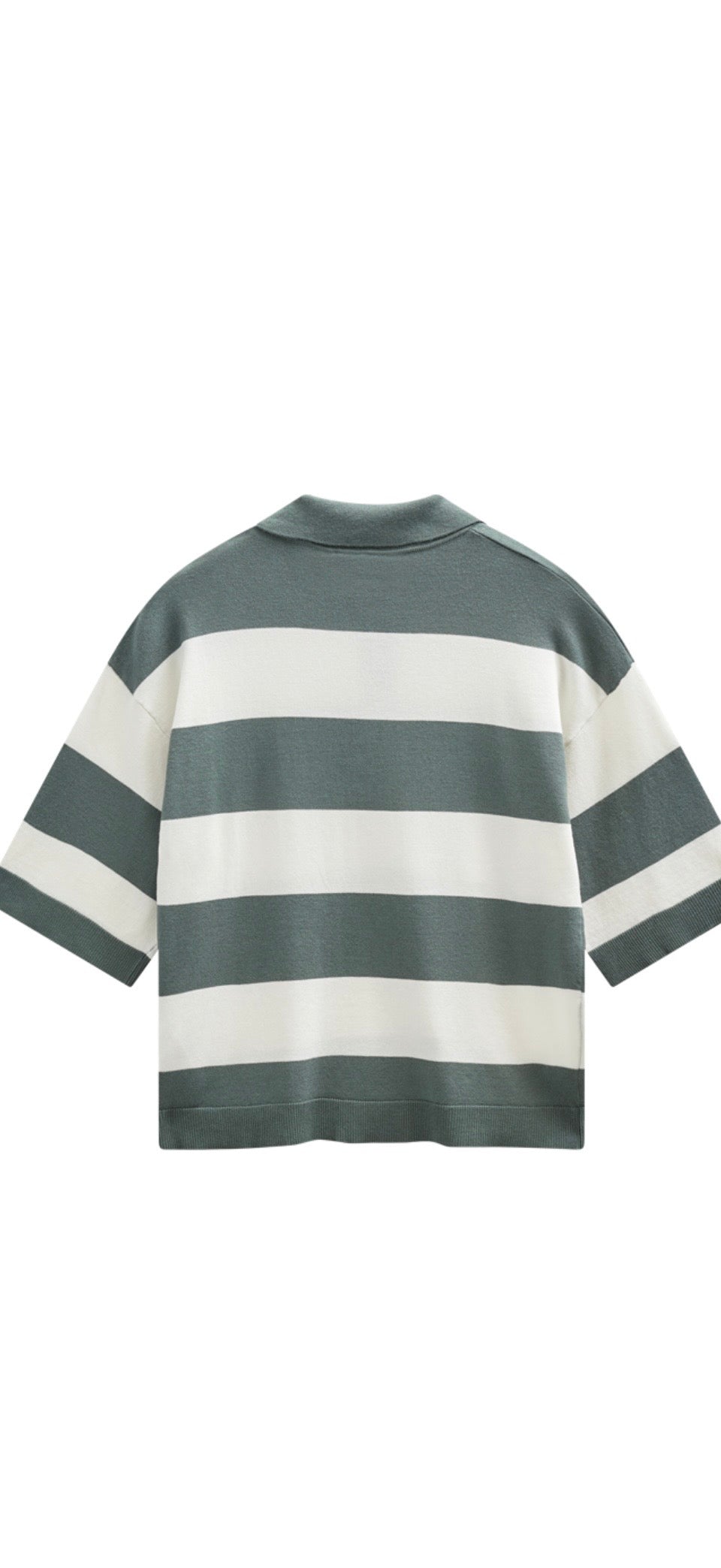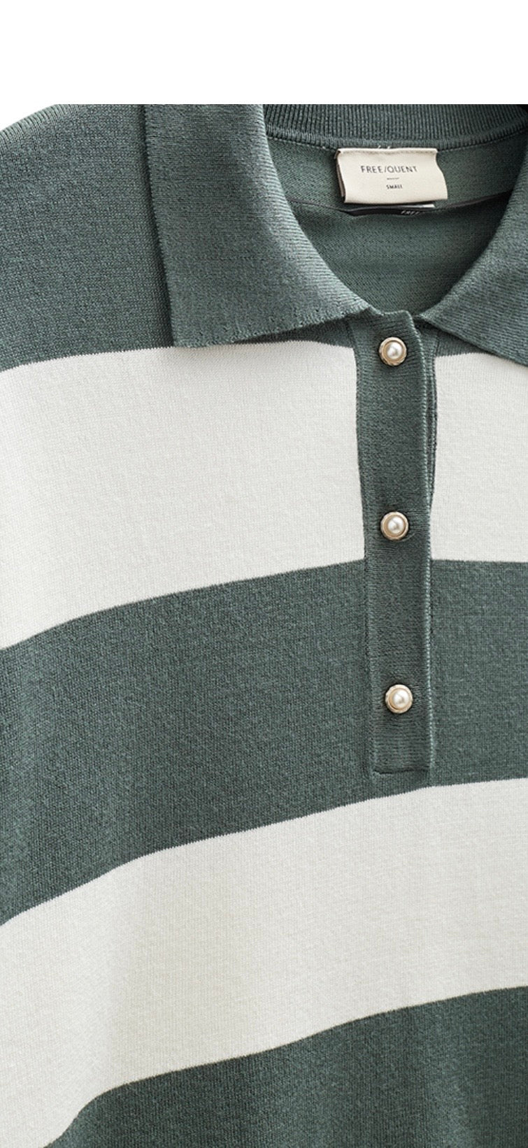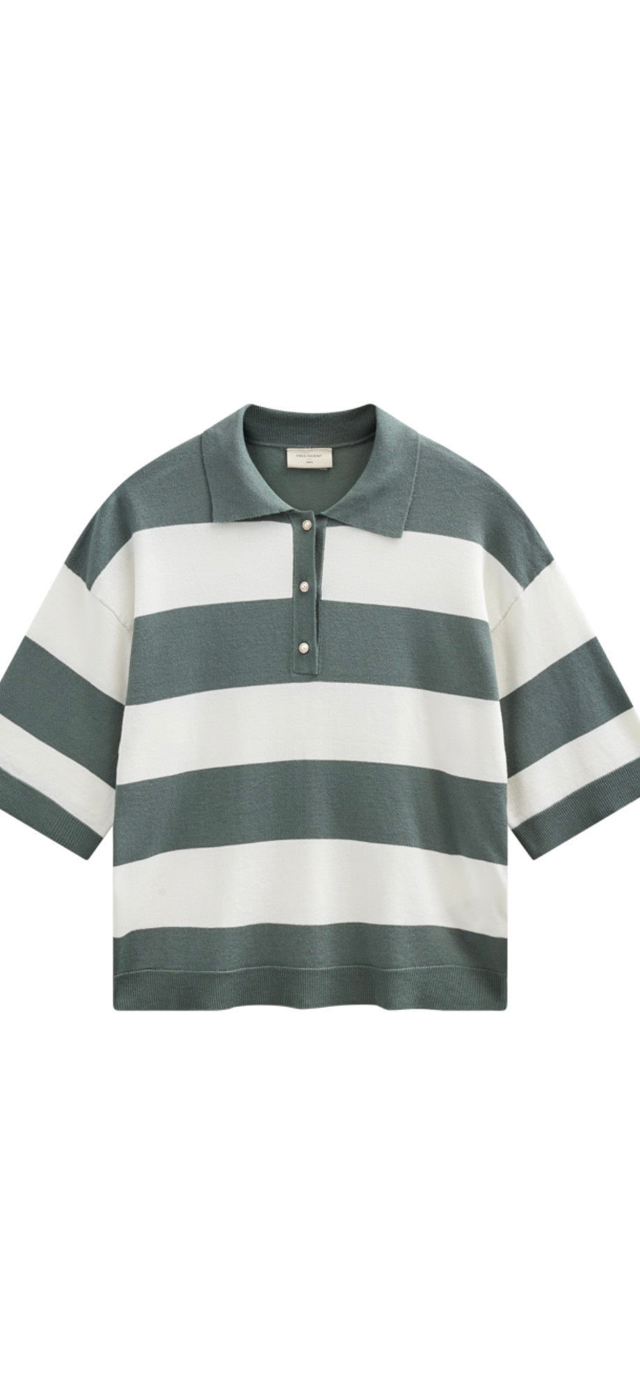 Pullover from Freequent in a soft, fine-knit material with stripes. The pullover has a simple silhouette with ribbing, a polo collar, button fastening on the chest and three-quarter sleeves with drop shoulders that highlight the loose fit of the pullover.