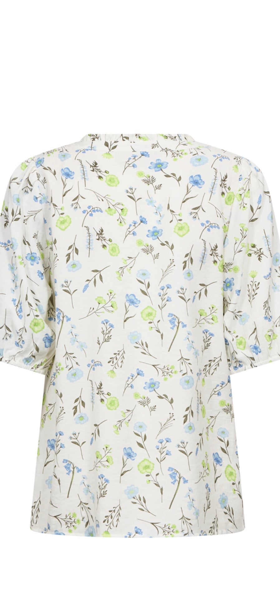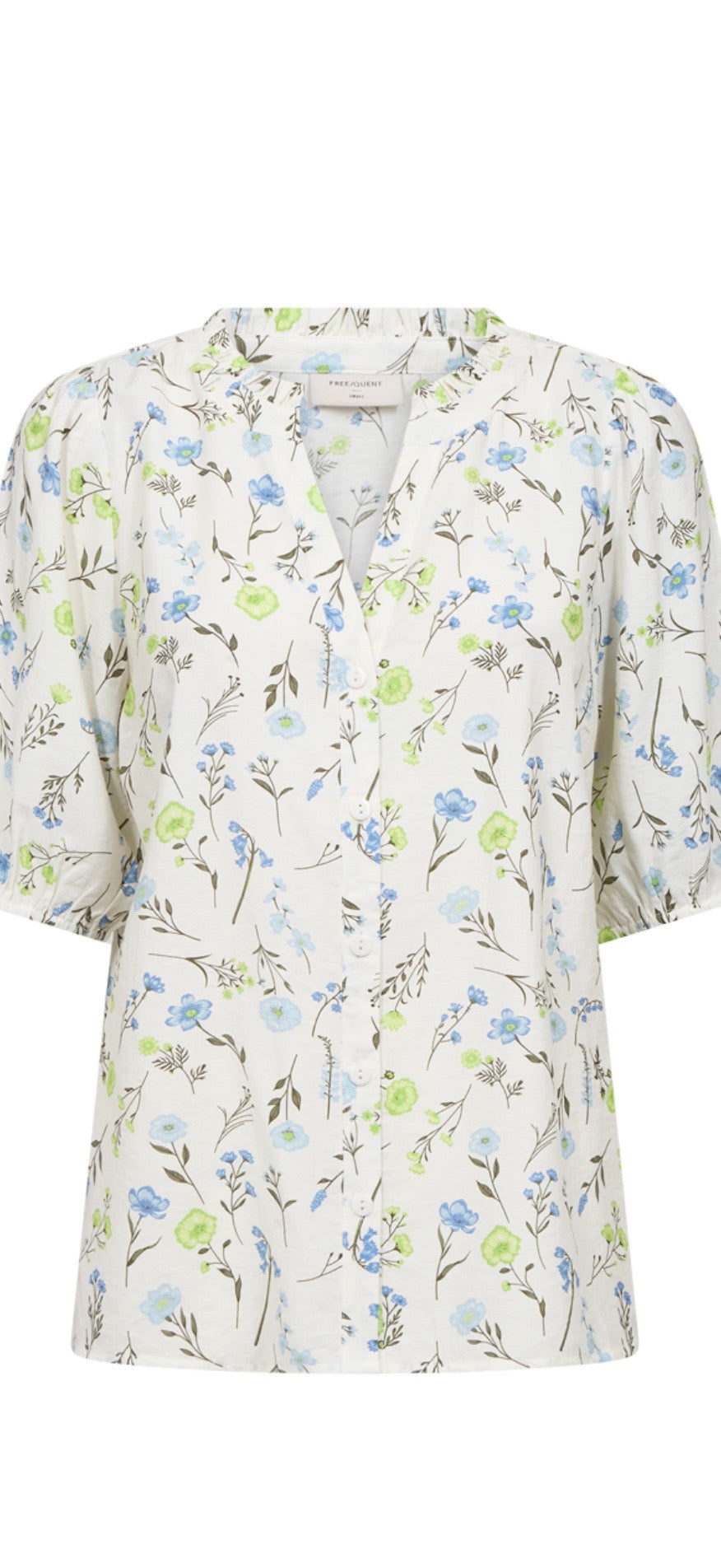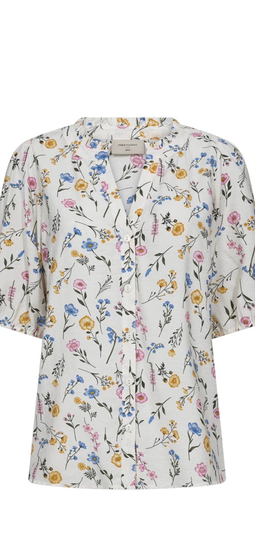 Shirt from Freequent in a light material. The shirt has a simple silhouette with a loose fit, button fastening along the front, half sleeves with elastic edge and V-neck with a ruffled edge.