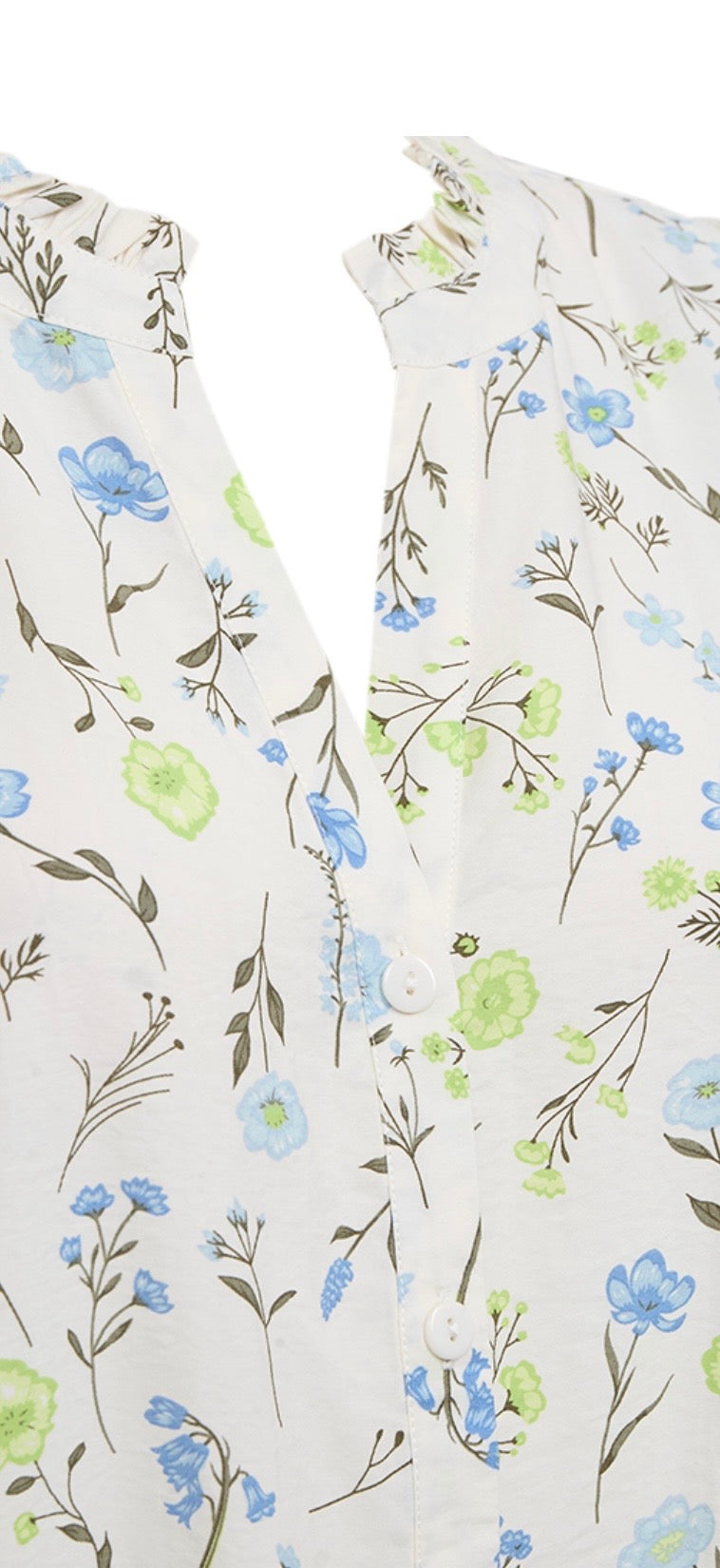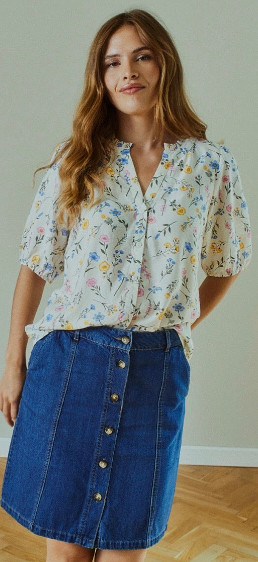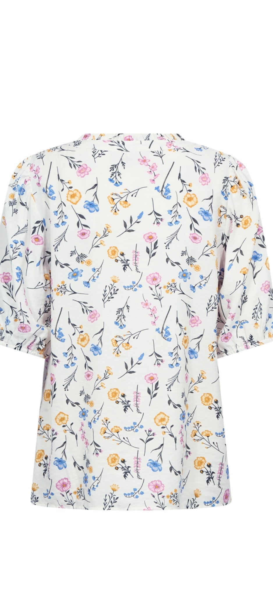 Shirt from Freequent in a light material. The shirt has a simple silhouette with a loose fit, button fastening along the front, half sleeves with elastic edge and V-neck with a ruffled edge.