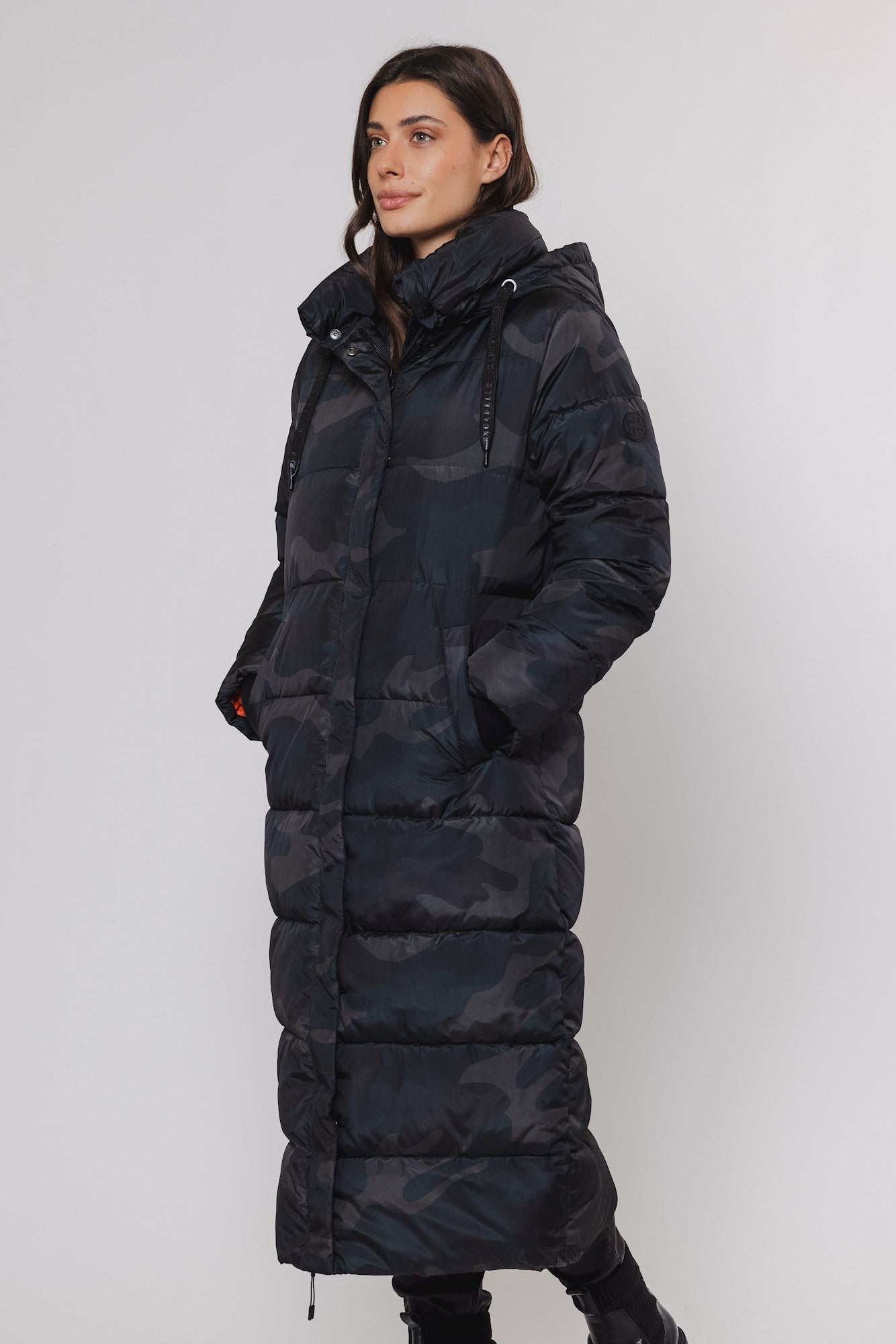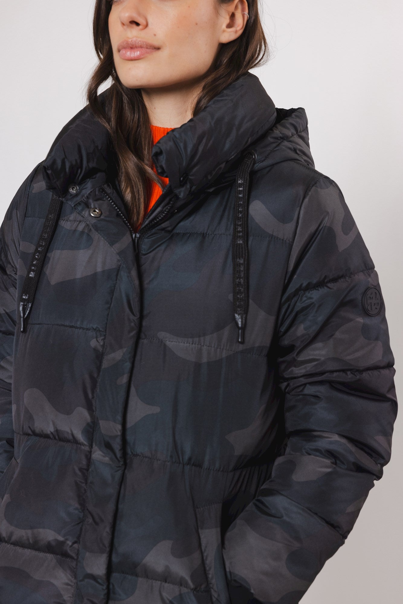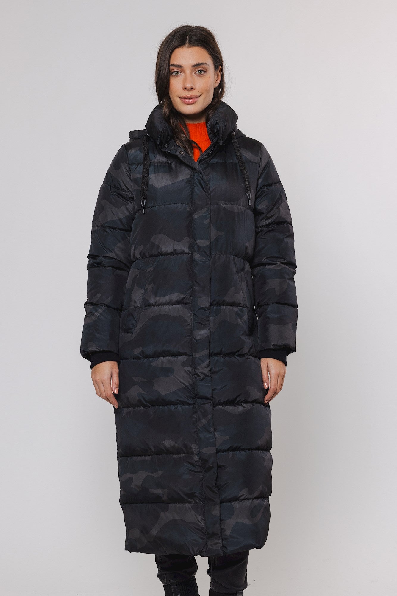 This long comfortable women's coat with hood is a style icon this season. This padded coat features a unique design with hidden zipper closure, a drawstring in the hood, two front pockets and a playful colour on the inside.